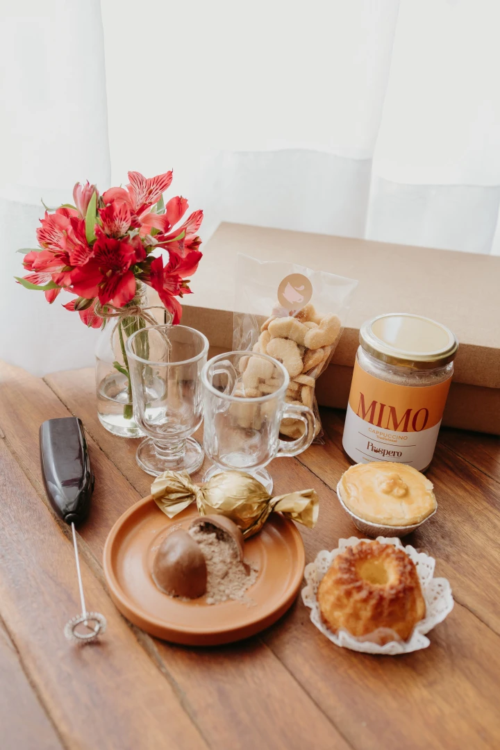 Caixa G + Cappuccino Mimo 200g + mini vaso de flores +100g biscoitos amanteigados + mini mixer + 2 taças + 2 capsulas de amor + bolinho de laranja + empadinha de frango