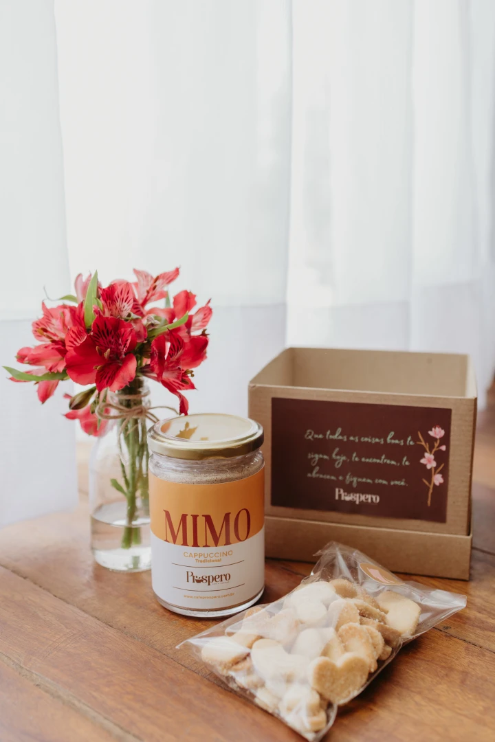 caixa P + Cappuccino Mimo 200g + mini vasos de flores + biscoitos amanteigados. - Usamos flores naturais. Geralmente astromelias ou rosas. Escolhemos as mais frescas e bonitas do dia.